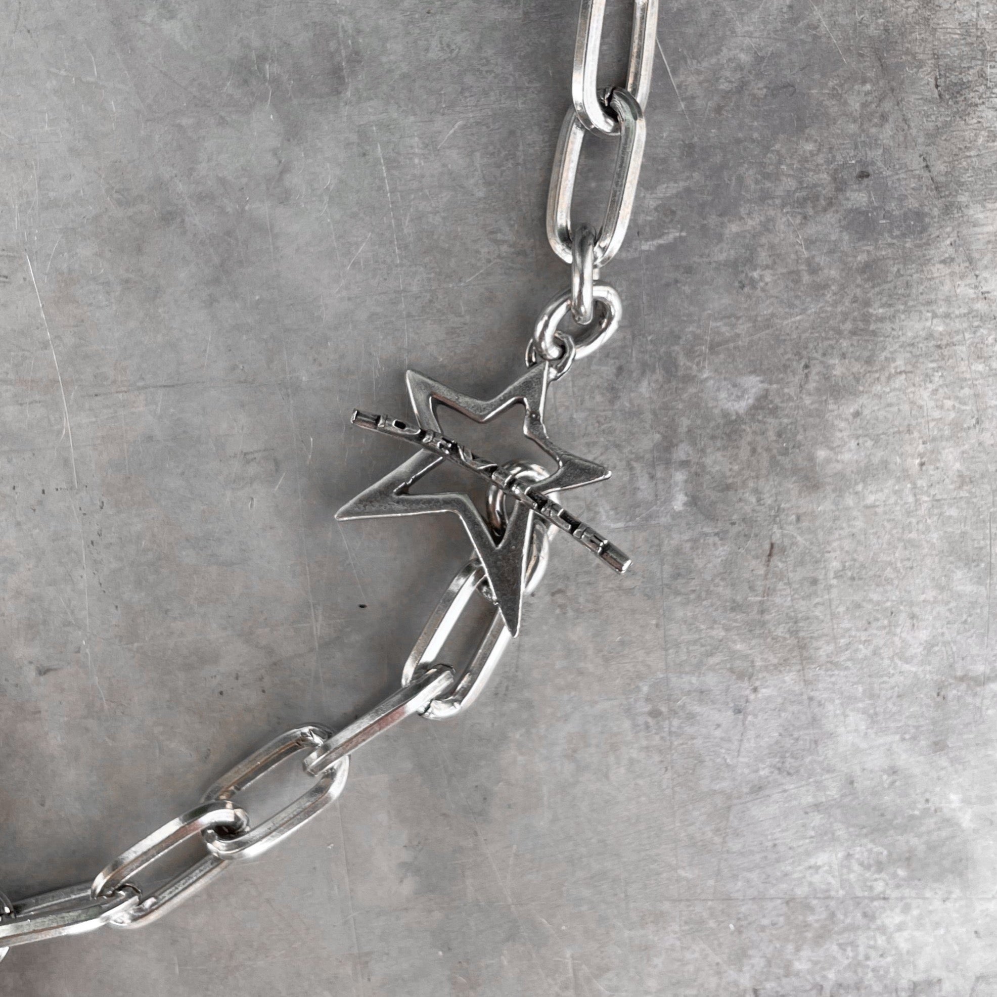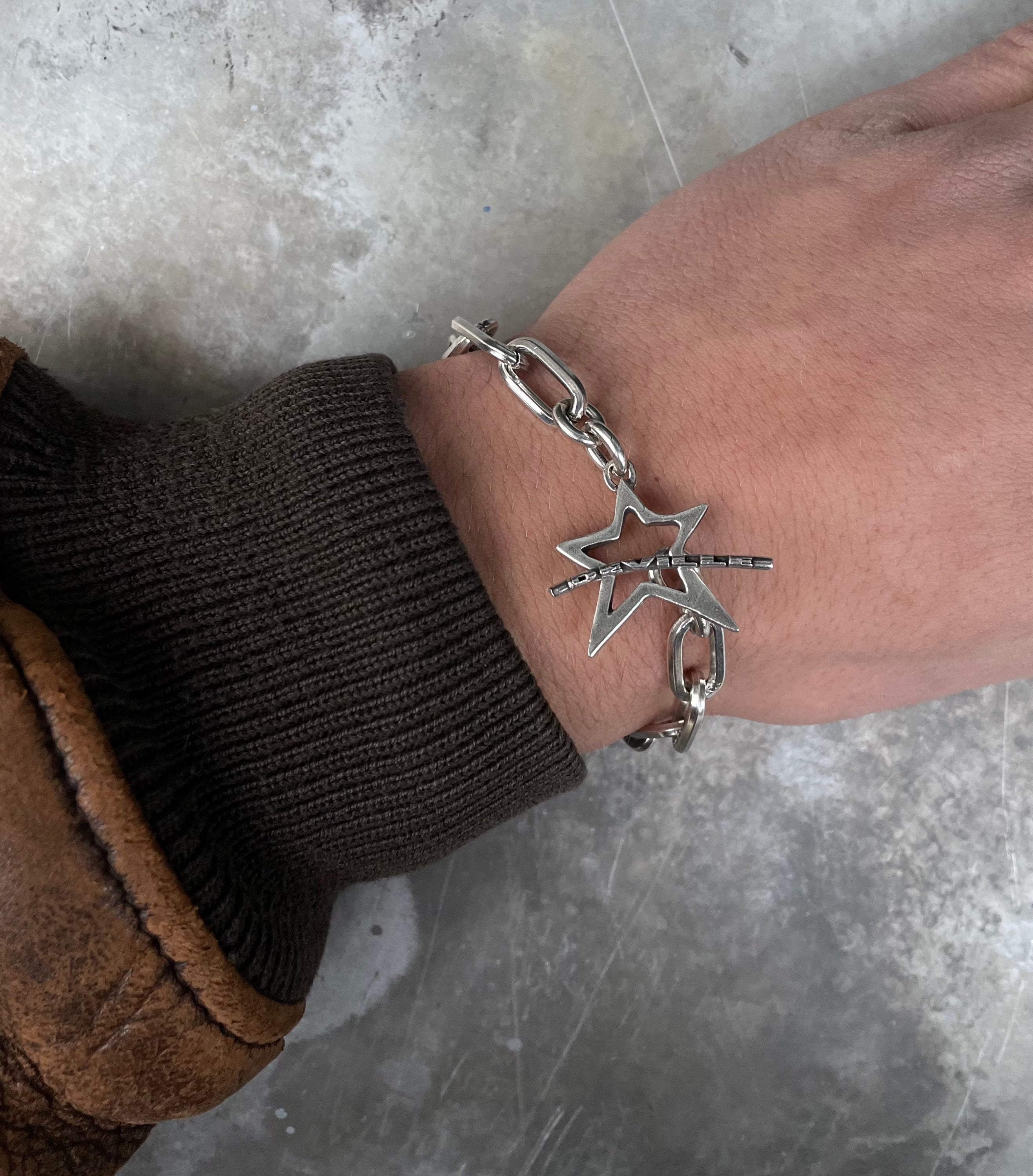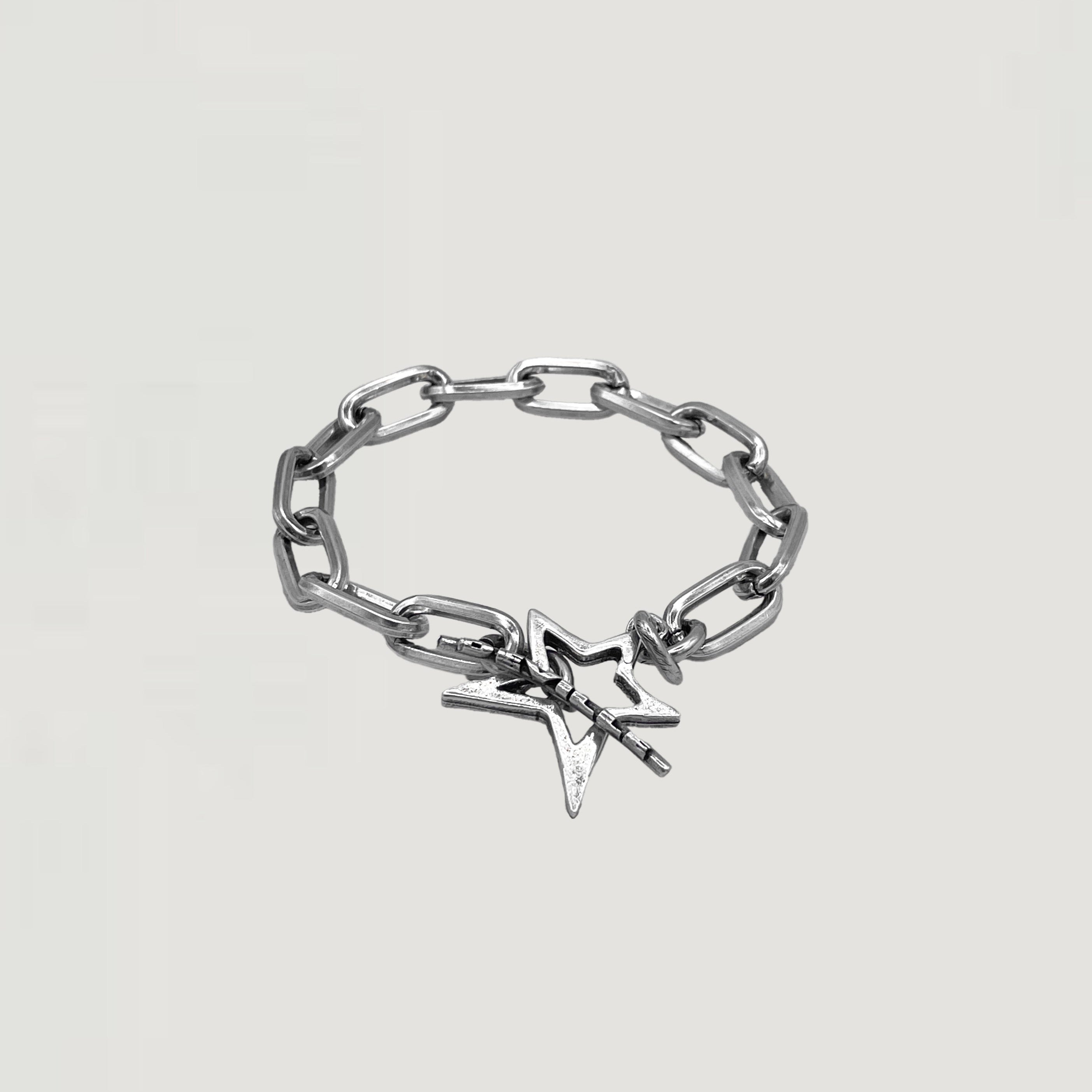 The "Wanna Feel" bracelet is a bold and modern piece, featuring chunky silver links paired with an eye-catching star clasp. The oversized star adds a playful yet edgy vibe, perfect for those looking to make a statement with their accessories.
