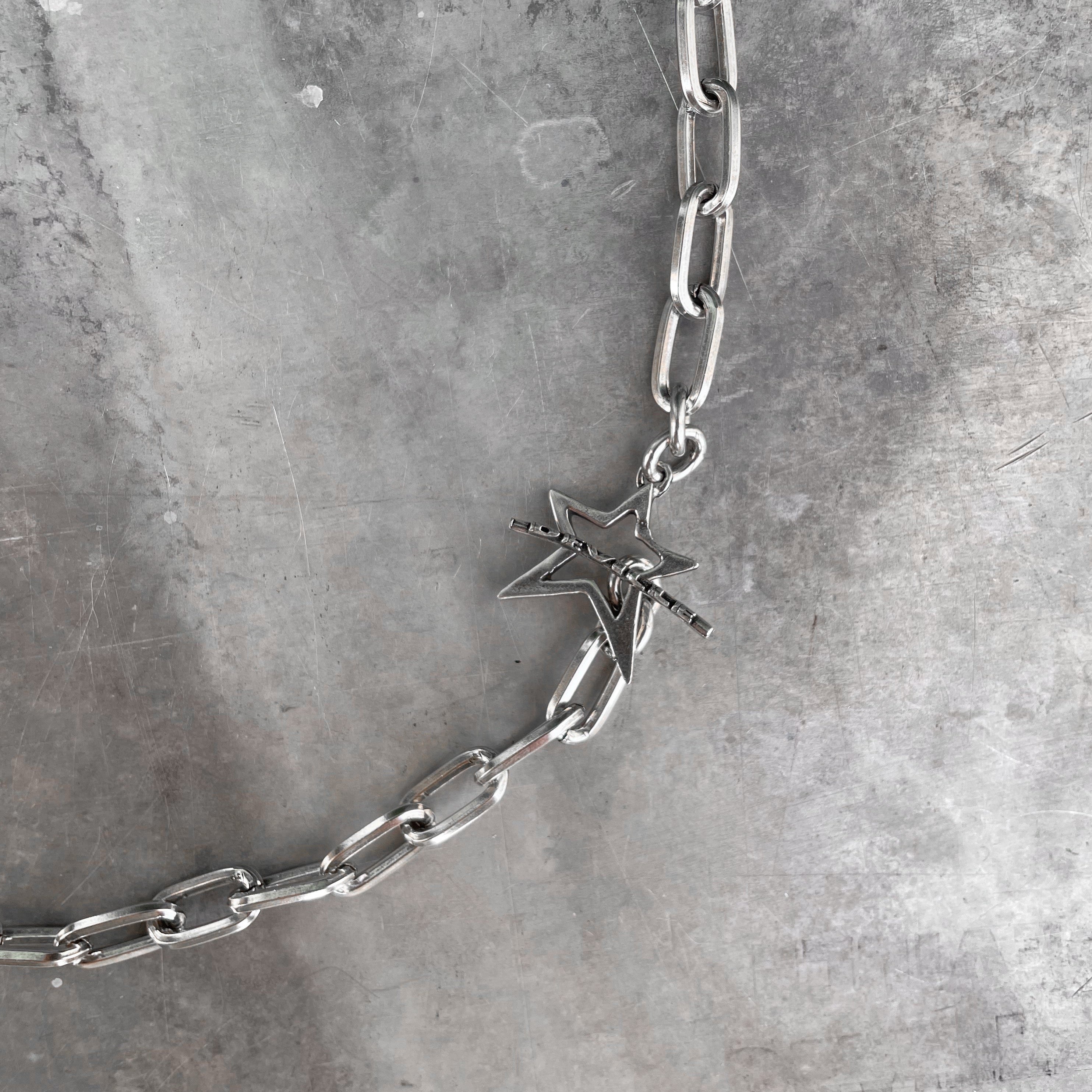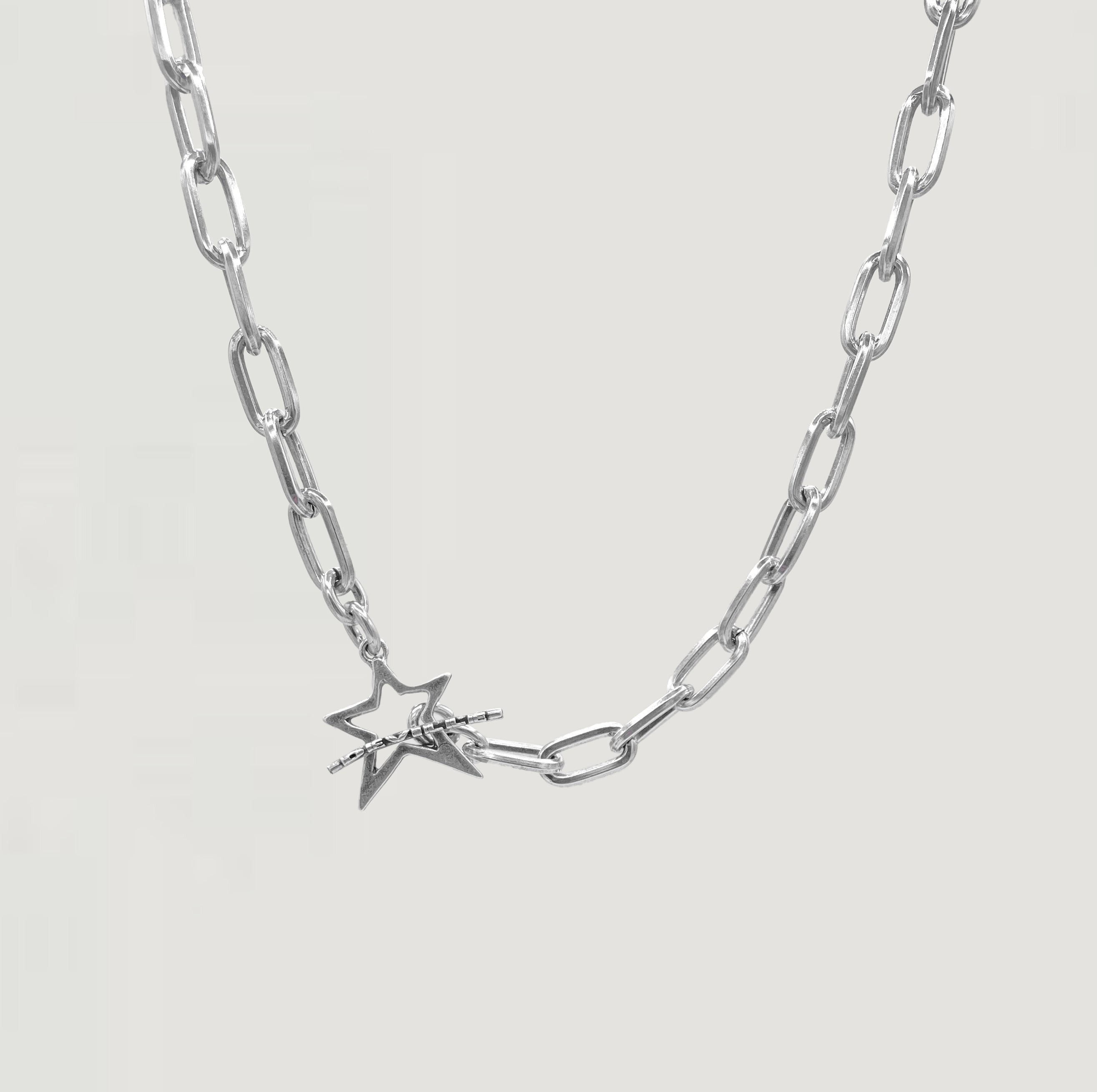 The Wanna Feel necklace combines an industrial-style chain with a star-shaped toggle clasp, adding an edgy yet refined touch. Handcrafted from silver, this piece reflects a bold aesthetic, perfect for those seeking a statement accessory.