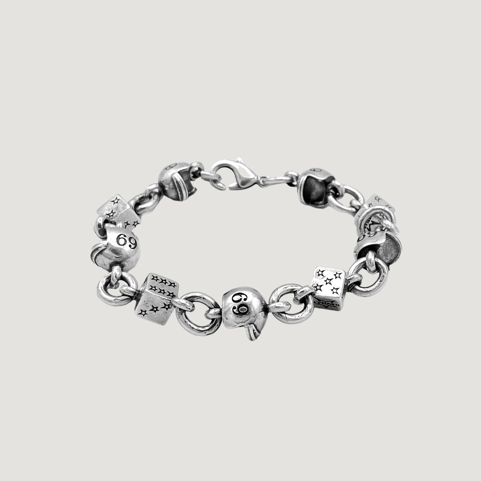 The Racing bracelet is a bold and dynamic accessory inspired by the thrill of speed and the spirit of competition. This bracelet features intricately detailed charms like helmets, racing dice, and stars, all in silver, symbolizing the adrenaline of the race track.