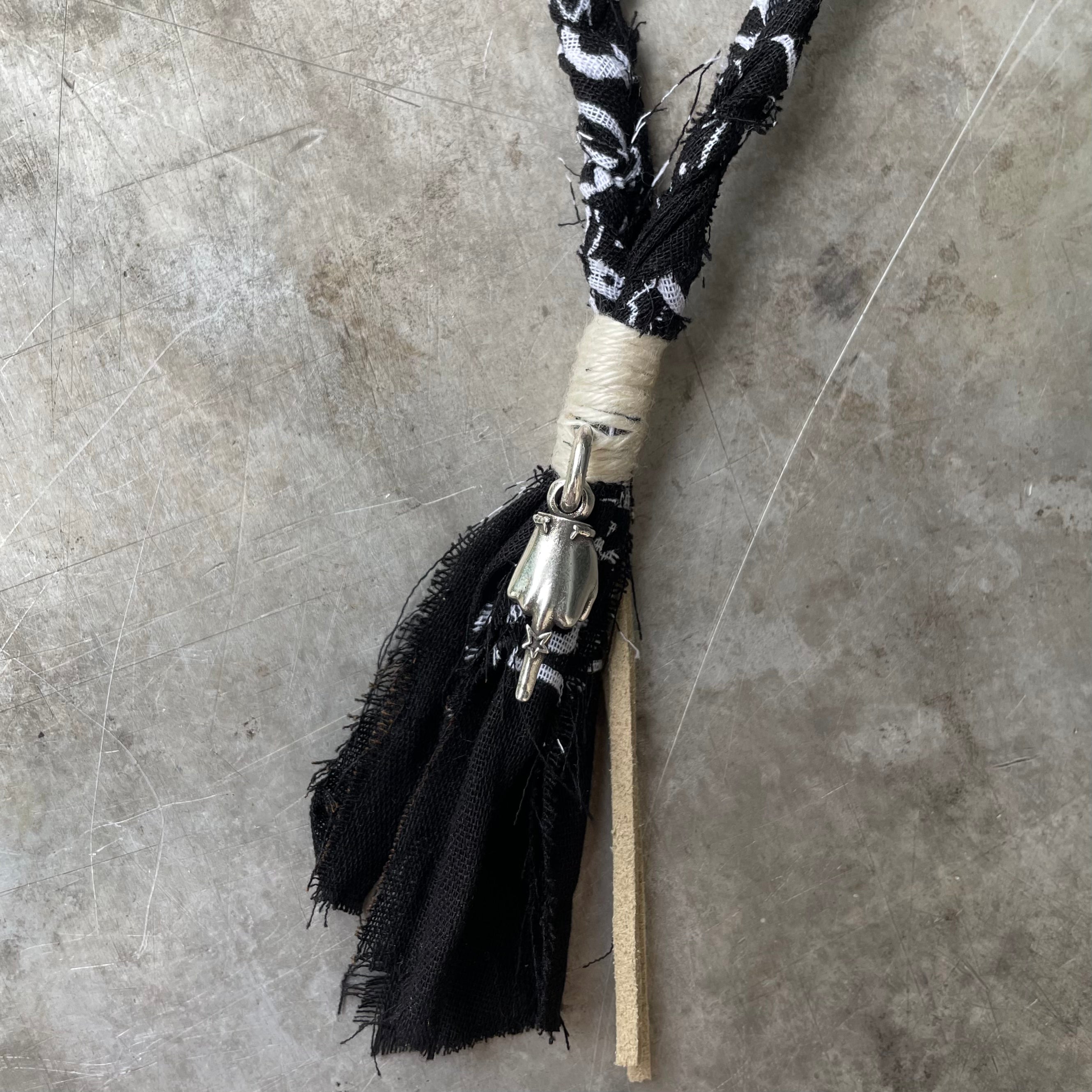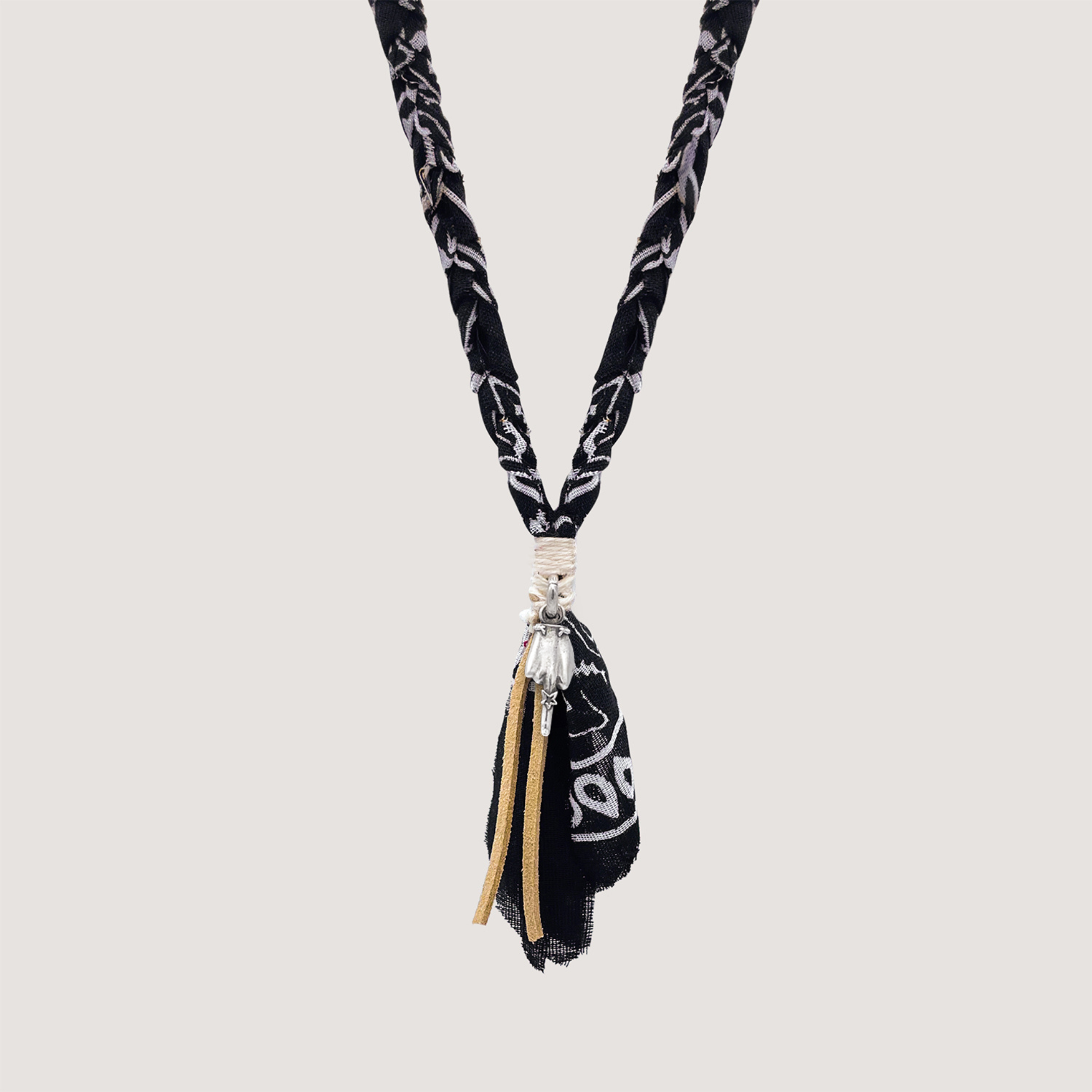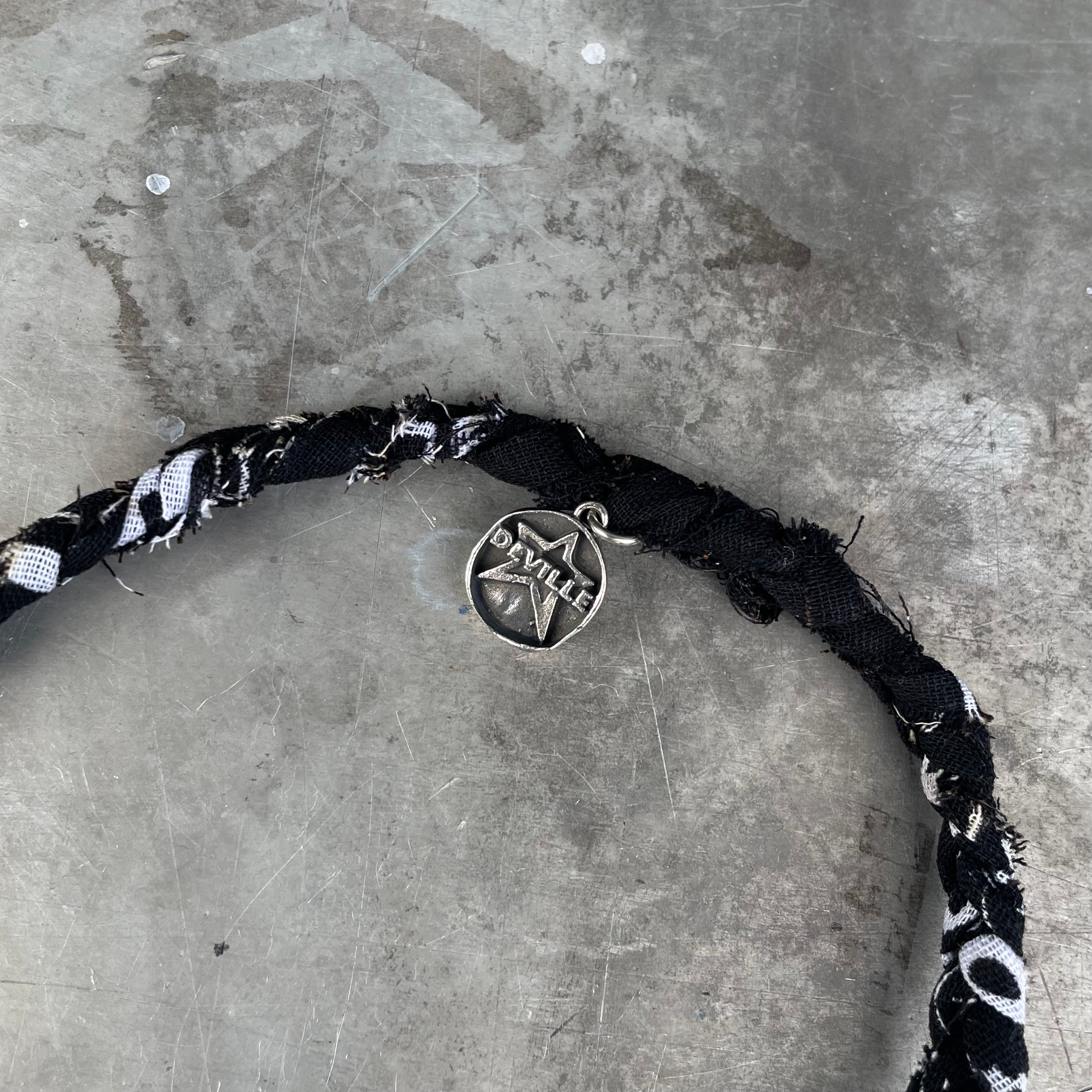 The Black F**k You bandana is a bold and rebellious accessory. Featuring a twisted hand-made black bandana with silver charm and Deville star charm, this necklace is a striking statement piece.