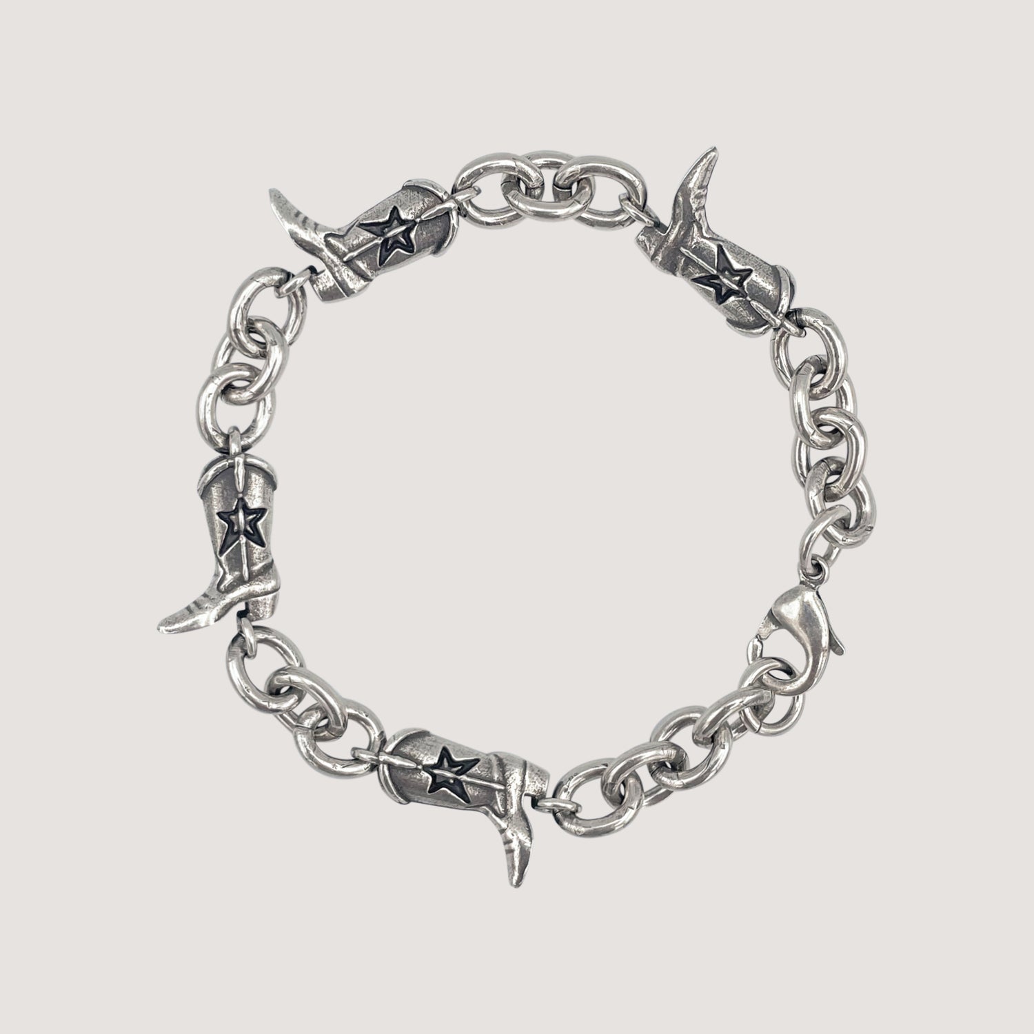 The Boots bracelet is a bold accessory with a Western flair. Featuring multiple mini boot charms linked together by a sturdy chain, this bracelet combines rugged charm with stylish edge.