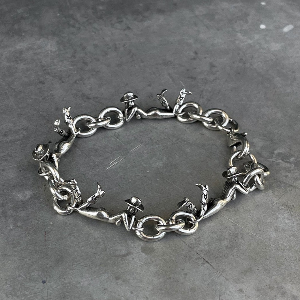 The Cowgirls Bracelet is a bold and playful accessory that features detailed cowgirl charms linked together with oversized chain links. Available in both silver and gold, this bracelet makes a unique statement and highlights Deville’s craftsmanship, perfect for those who want to add an edgy and whimsical touch to their look.