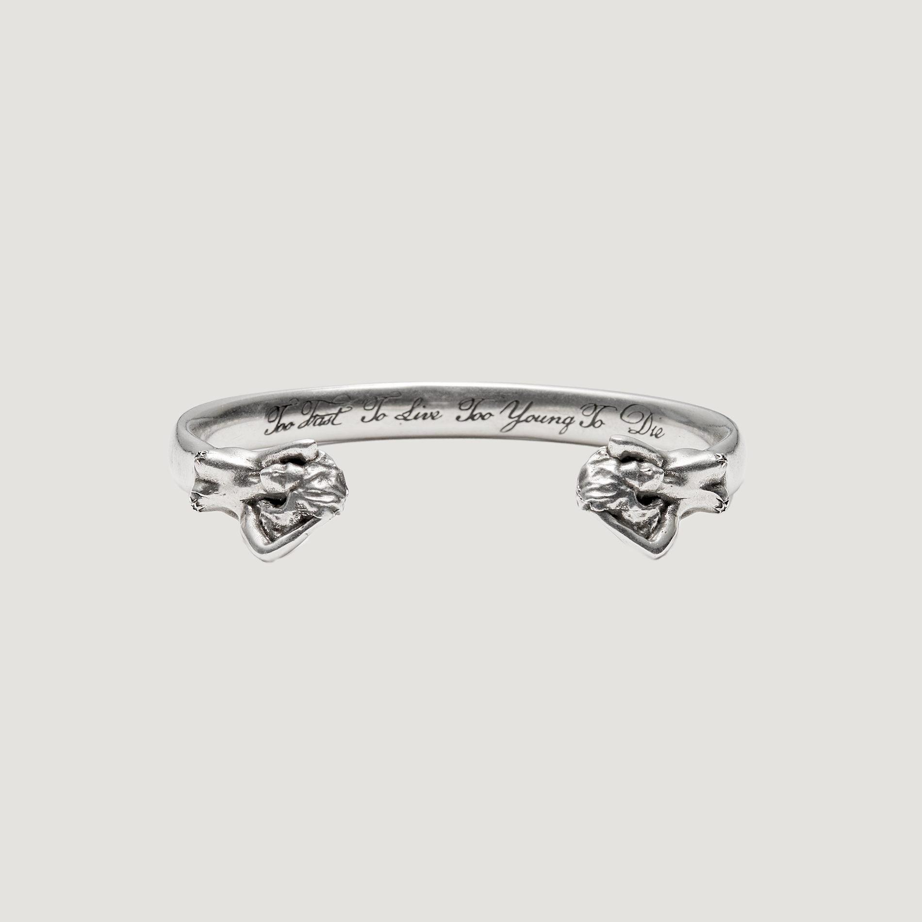 The "Too Fast To Live" bracelet is an intricately designed accessory that symbolizes a rebellious spirit and a carefree attitude toward life. Available in both silver and gold, the bracelet features two iconic skull details at either end, paired with the engraving "Too Fast to Live, Too Young to Die" on the inside, evoking a rock 'n' roll vibe.