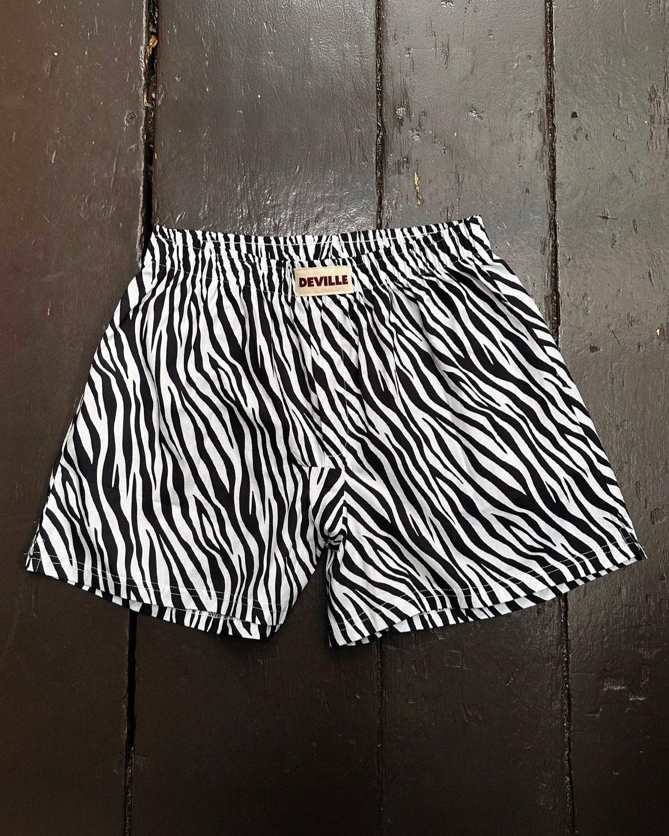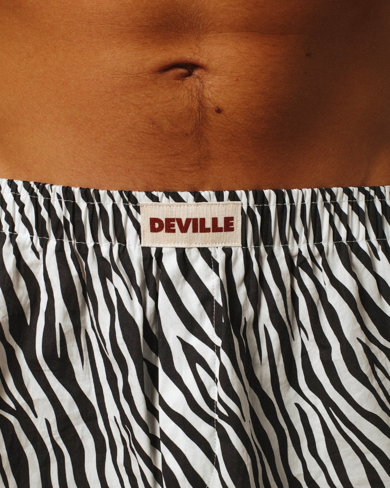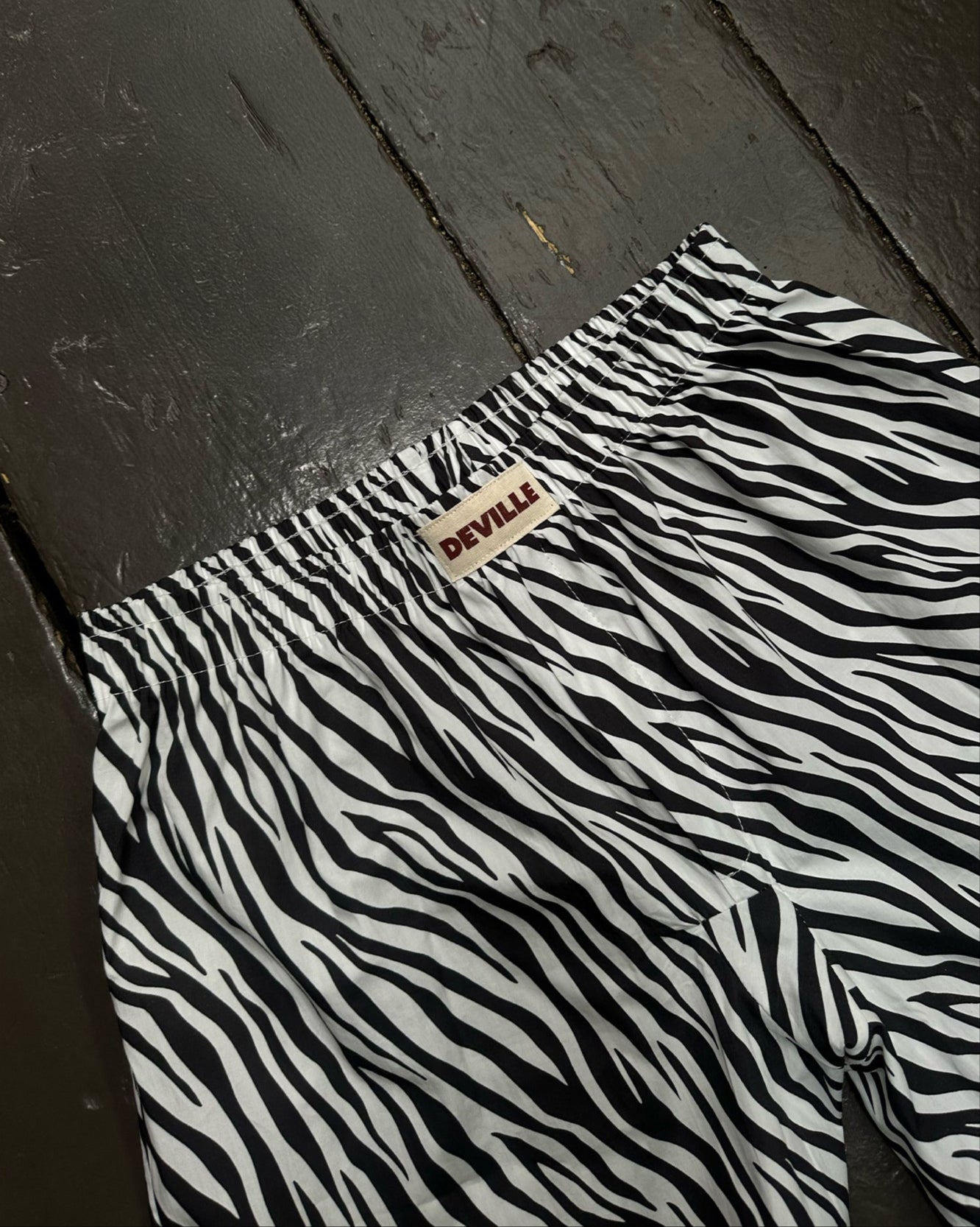 It features a bold elastic waistband with the Deville logo printed on a canvas patch.