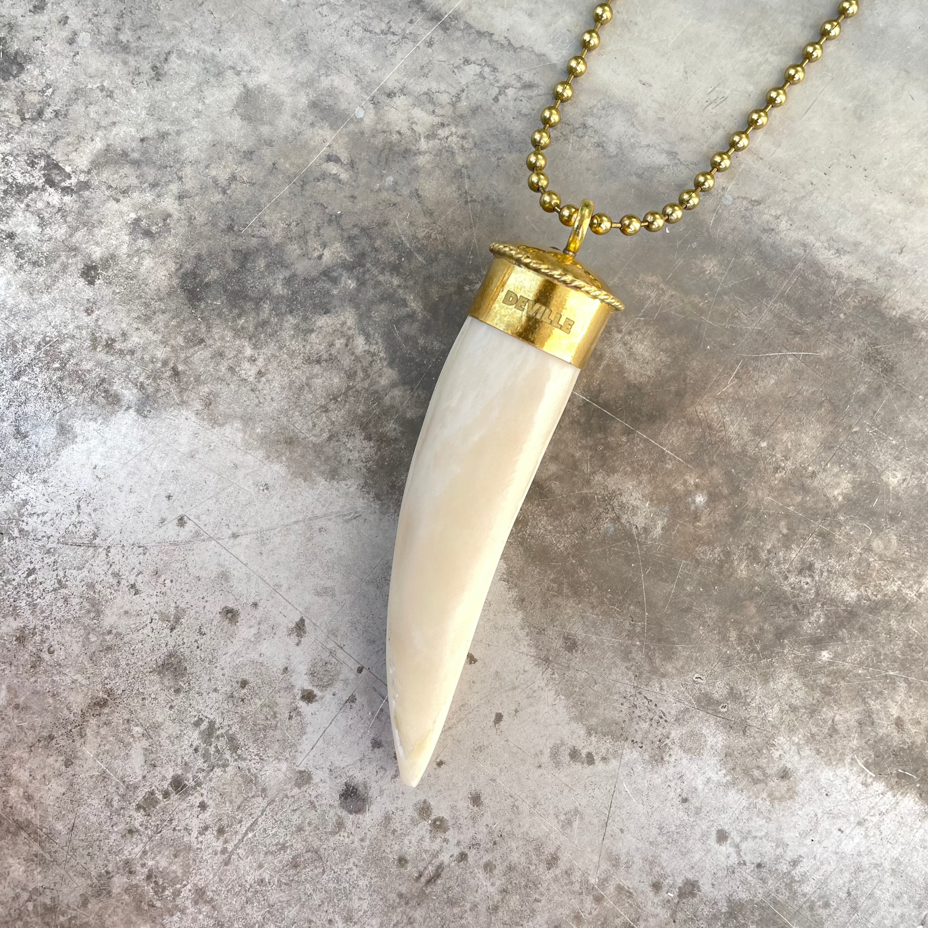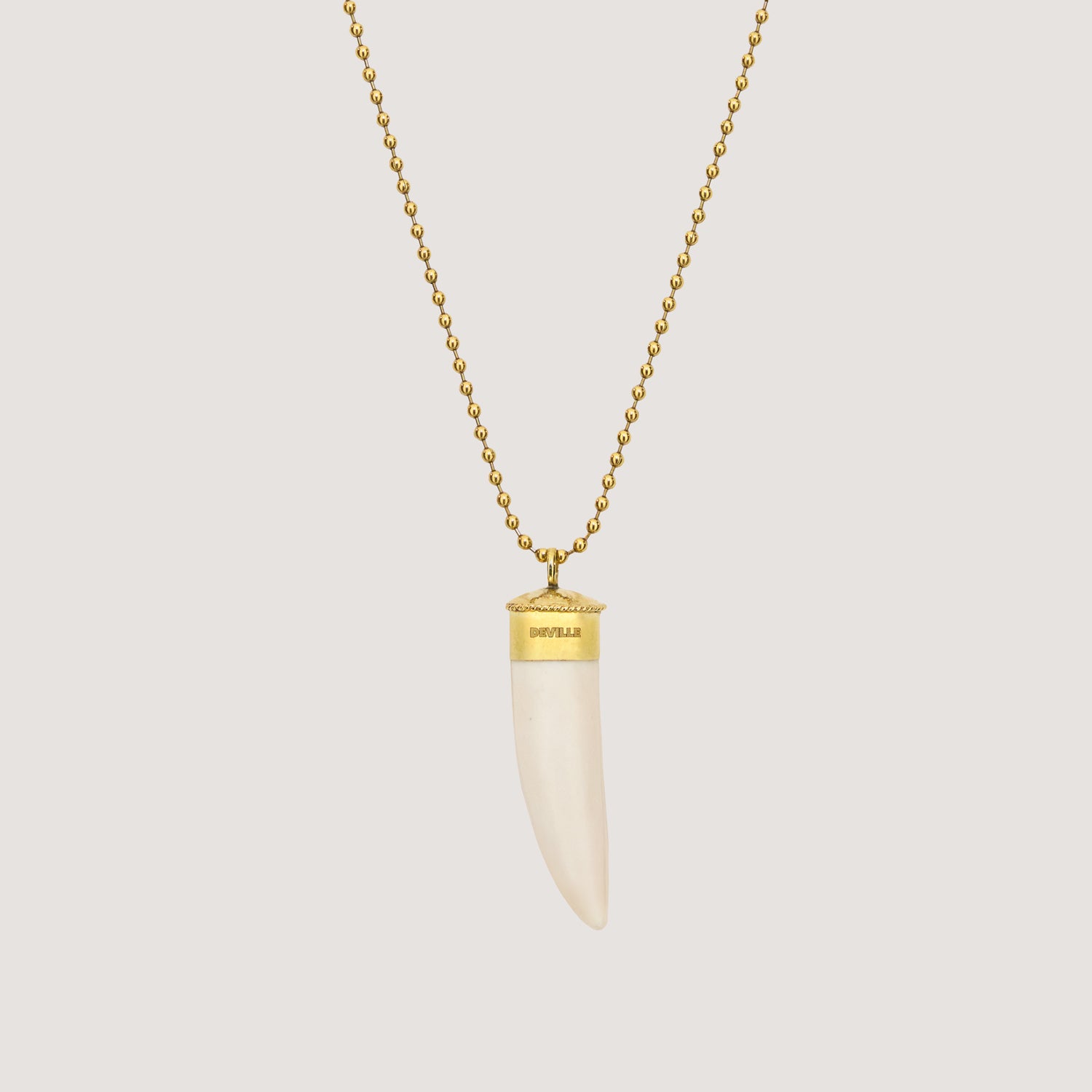 The Deville Horn Necklace is a striking statement piece that blends modern elegance with bold design. Featuring a sleek white horn pendant capped in gold, this necklace adds a touch of sophistication to any look.