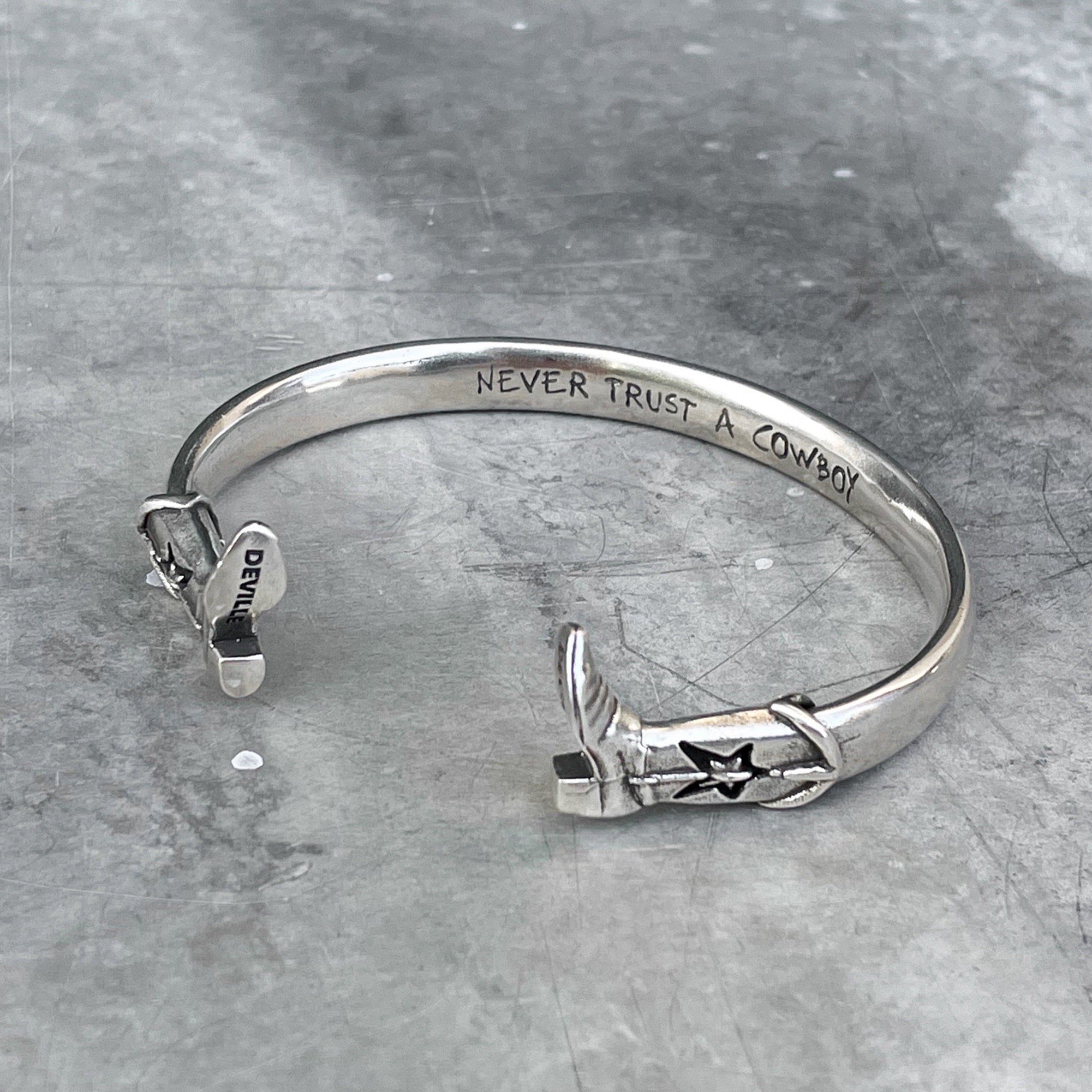 The Never Trust a Cowboy bracelet is a bold cuff-style piece that captures the spirit of rebellion. Crafted in both silver and gold, it features detailed cowboy boots at each end, engraved with the Deville logo.